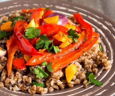 BUCKWHEAT (100 G READY-MADE) WITH CHICKPEAS / BEANS (50 G READY-MADE) AND STEAMED VEGETABLES (200 G)Fat12gCarbs48gProtein19g