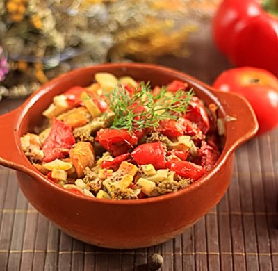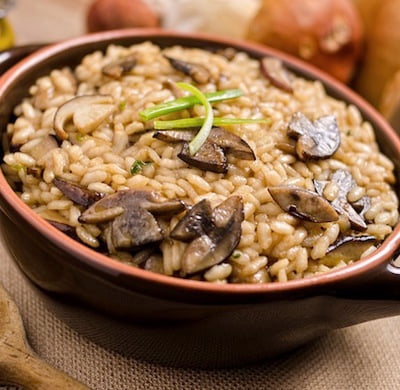 RICE (150 G) WITH MUSHROOMS (30 G) AND EGG AND EGGPLANT (100 G), BAKED WITH TOMATOES (60 G), HERBS AND PARMESAN (10 G)