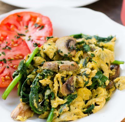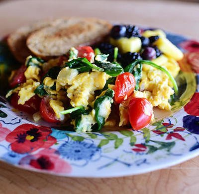 SCRAMBLE (2 PCS) WITH TOMATO (50 G), MUSHROOMS (50 G) AND HERBS, AND SUNFLOWER SEEDS (20 G) AND BERRIES (150 G)