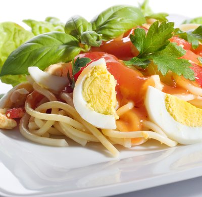 SPAGHETTI (150 G) WITH AN EGG (1 PC.), TOMATO (50 G) AND A SALAD OF PEPPER, CUCUMBER AND SEAWEED (150 G)