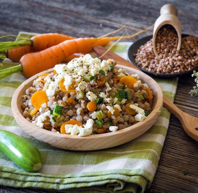 Mix vegetables with lettuce or arugula, season with oil and spices. Serve vegetables with buckwheat.