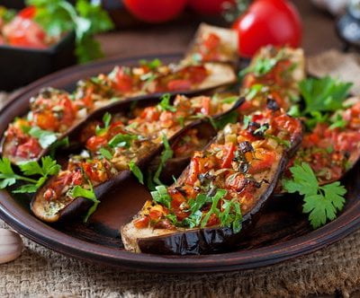 We mix vegetables with mushrooms and put the resulting stuffing in eggplant boats;