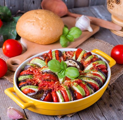 Ratatouille served with turkey rolls.